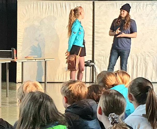Die Schüler:innen hatten damit die Möglichkeit, in die Rolle der Eltern hineinzuschlüpfen, sich auf einen Perspektivwechsel einzulassen und ihre Lösungsmöglichkeiten mitzuteilen. Ihre Vorschläge waren strenger als man das von Eltern kennt. Der am Anfang erwähnte Satz „Einfach den Computer zerstören“ war eine von verschiedenen Antworten darauf. Bei der Besprechung erkannten die Schüler:innen, dass es nicht ganz einfach ist, in einer solchen Situation richtig zu handeln. Bei der Frage, wie lange Benny täglich Medien nutzen sollte, waren die Antworten überwiegend streng und Widersprüchlichkeiten mit dem eigenen Verhalten wurde deutlich. Beim Nachgespräch konnten die Schülerinnen selbst Vorschläge zu Szenen einbringen und auf der Bühne präsentieren. Hoch konzentriert verfolgten die Schüler:innen das Spiel auf der Bühne und brachten sich begeistert bei der Nachbereitung ein.