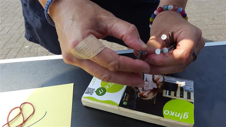 Die zweite Aktion des Standes war die sogenannte „Nagelprobe“. Dabei müssen 10 Nägel ohne Hilfsmittel auf einem einzigen Nagelkopf platziert werden. Abgefragt werden bei dieser Übung zum Beispiel Problemlösestrategien und der Umgang mit Frustration. Denn auf den ersten Blick scheint diese Aufgabenstellung unlösbar. Wie also damit umgehen? Es gar nicht erst versuchen, andere Leute nach der Lösung fragen oder vielleicht so lange rumprobieren bis man es geschafft hat? Das kann mitunter ziemlich frustrierend werden, wenn das erhoffte Ergebnis ausbleibt. Diese kleine Übung ist ein guter Aufhänger, um sich mit den Besuchenden über ihren Umgang mit (scheinbar unlösbaren) Problemen und Frustrationen zu unterhalten. Für die Suchtprävention ist das von Interesse, da einerseits vielseitige und konstruktive Problemlösestrategien vor der Entwicklung einer Suchterkrankung schützen können und gleichzeitig weniger konstruktive Strategien, wie beispielsweise der Konsum von Alkohol und anderen Substanzen, ein Risiko darstellen. Und natürlich macht es auch noch Spaß, wenn man es am Ende schafft, die Aufgabe zu lösen.