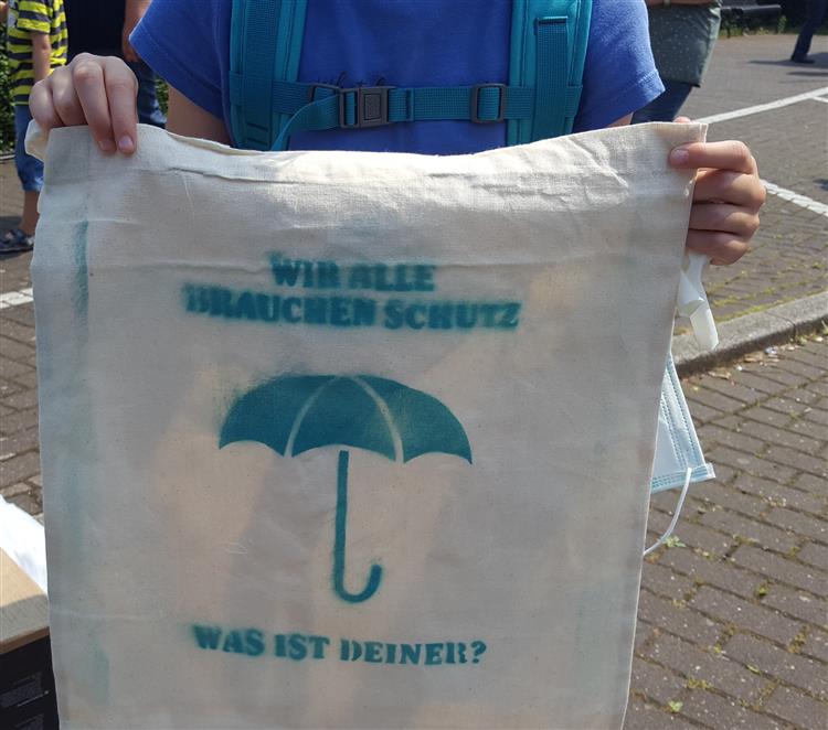 Zum einen konnten die Besuchenden des Standes mithilfe einer Schablone eine Stofftasche mit 3 verschiedenen Motiven besprühen, jede der Schablonen versehen mit dem Spruch: „Wir alle brauchen Schutz, was ist deiner?“ und einem Schutzsymbol (ein Regenschirm, ein Schild und eine Sonnenbrille). Das Motiv erregt Aufmerksamkeit und der Spruch bringt vielleicht die ein oder andere Person dazu, sich kurz Gedanken über die eigene Antwort auf die Frage zu machen.
