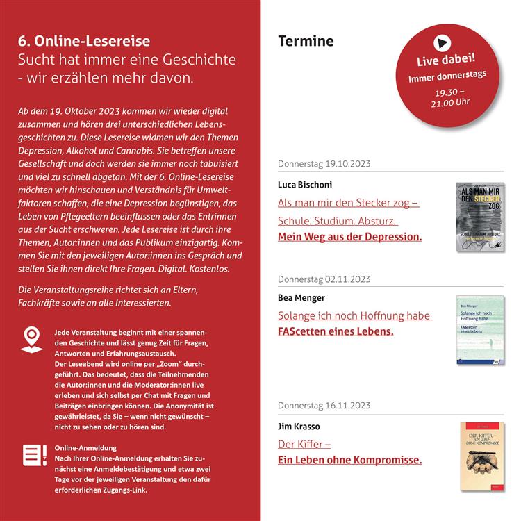 Vom 19.10. bis 16.11.2023 fand zum sechsten Mal die Online-Lesereise "Sucht hat immer eine Geschichte" statt. Die drei Lesungen boten ganz unterschiedliche Schwerpunkte: Depression, das Fetale Alkoholsyndrom sowie Cannabiskonsum. Es schlossen sich jeweils berührende Nachfragen und Diskussionen an, die die Mitarbeitenden der beteiligten Fachstellen einfühlsam moderierten.